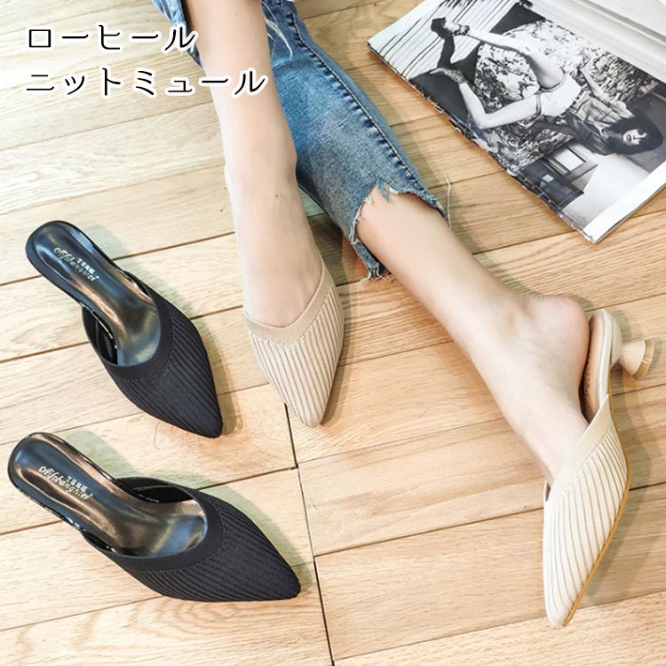 レディース ローヒール ニット ミュール サンダル ポインテッドトゥ アーモンドトゥ 靴 くつ おしゃれ 流行 楽ちん 痛くない ベージュ ブラック 黒 シンプル 無地 きれいめ こなれ感
